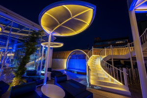 Roof garden (250 τ.μ.) με φανταστική θέα που εκτείνεται από τους γερανούς του λιμανιού και φτάνει μέχρι τον Όλυμπο, για ιδιαίτερα και μοναδικά bachelor & private parties