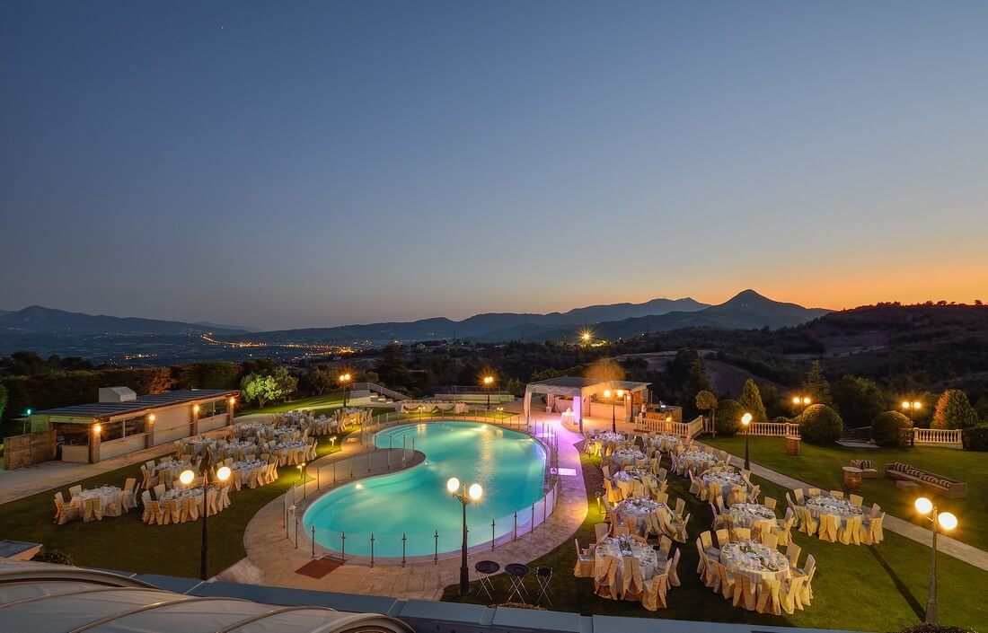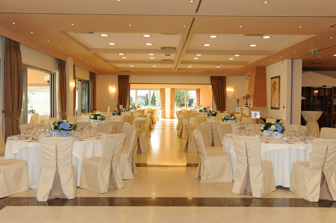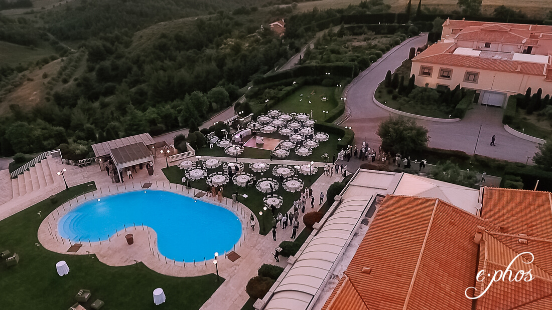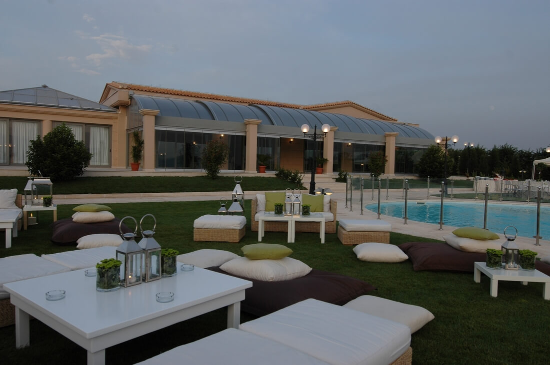Η εξαιρετική εργονομία του εξωτερικού χώρου χωρητικότητας έως 800 καθιστών ατόμων, επιτρέπει πολλαπλούς σχεδιασμούς - περιμετρικά της πισίνας και πάνω στο γκαζόν, για να δημιουργήσετε -ανάλογα με το πλήθος των καλεσμένων, τις γαστρονομικές, διακοσμητικές και μουσικές σας επιλογές, την εκδήλωση που ονειρεύεστε!