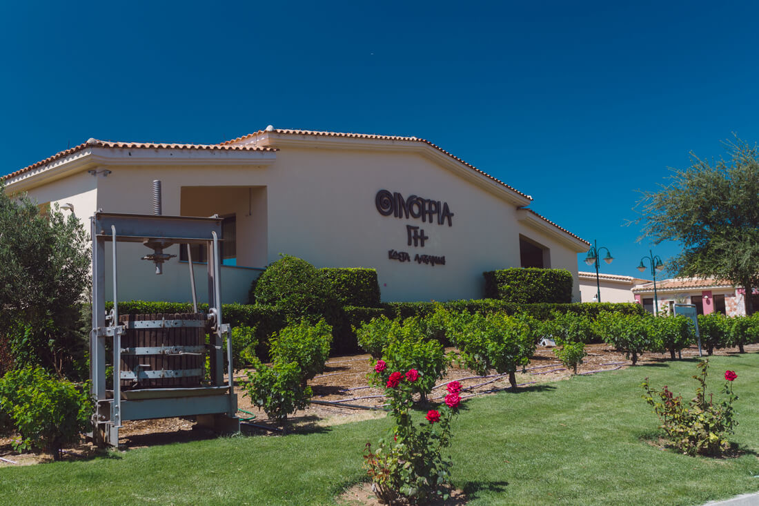 Η Οινότρια Γη περιλαμβάνει ένα μικρό, σύγχρονο οινοποιείο που αξιοποιεί αποκλειστικά την παραγωγή των ιδιόκτητων αμπελώνων της. Στο συγκρότημα 10.500 τετραγωνικών μέτρων φιλοξενούνται το Μουσείο Οίνου Κώστα Λαζαρίδη, 9 διαφορετικοί χώροι για τη διοργάνωση εκδηλώσεων και φυσικά οι υπόγειες κάβες για την παλαίωση των κρασιών.